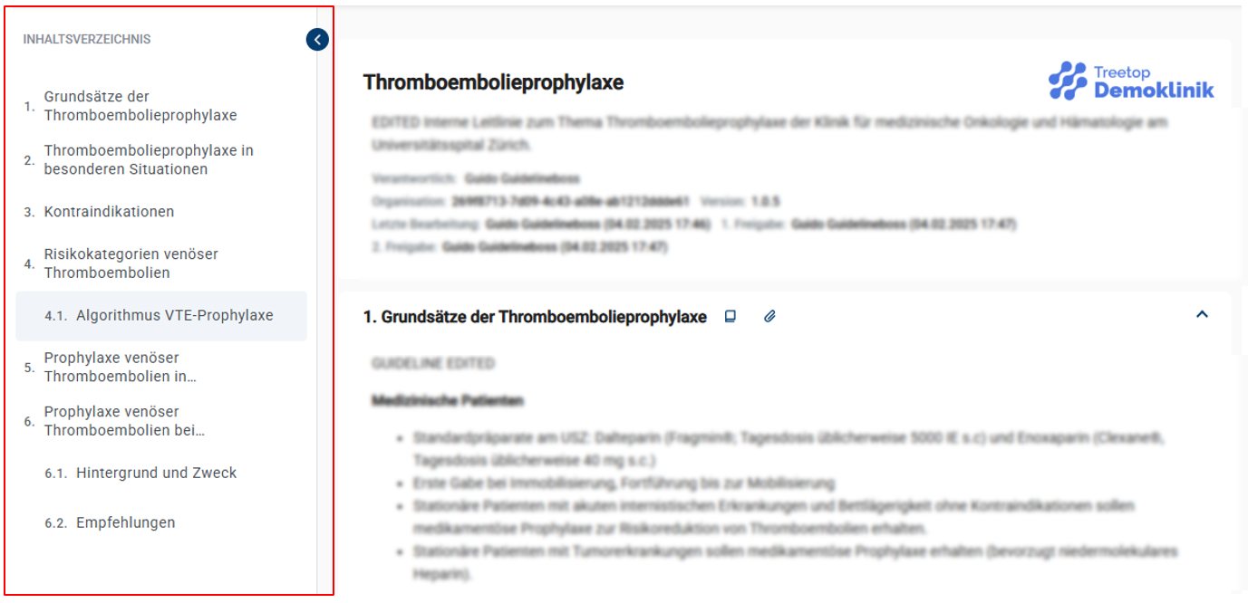 In einer ein- und ausklappbaren Sidebar links ist das Inhaltsverzeichnis der Guideline angeführt. Über dieses kann auch direkt zu gewünschten Kapiteln bzw. Unterkapiteln navigiert werden.