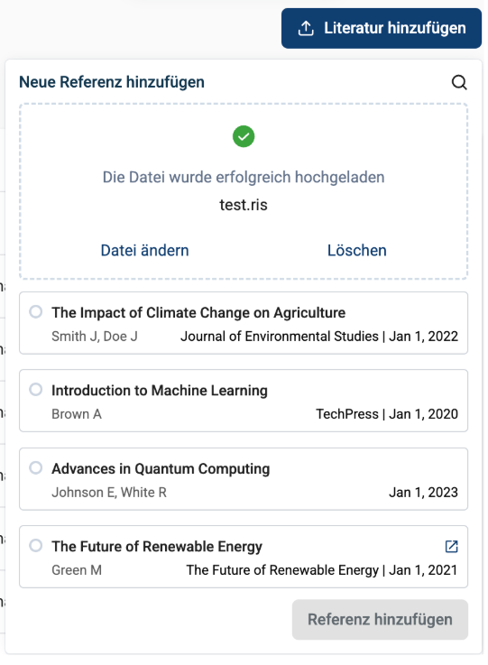 Es kann auch eine .ris oder .bib Datei hochgeladen werden, die mehrere Referenzen enthält.