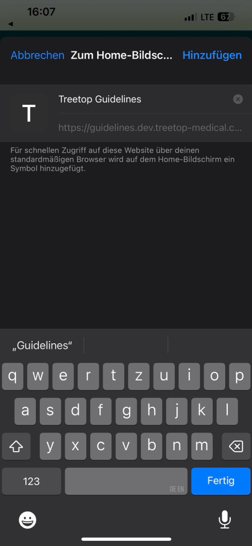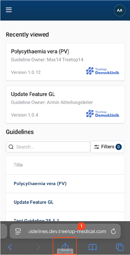 Öffnen Sie https://guidelines.treetop-medical.com direkt auf Ihrem iPhone und melden Sie sich mit Ihren Zugangsdaten an.